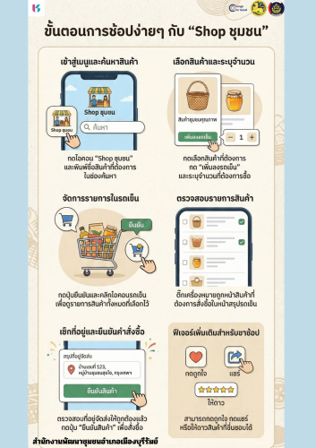 จากภาพประชาสัมพันธ์แสดงขั้นตอนการสั่งซื้อสินค้าชุมชนอย่างง่าย เริ่มจาก เข้าสู่เมนู Shop ชุมชนและค้นหาสินค้าที่ต้องการ จากนั้น เลือกสินค้าและระบุจำนวน พร้อมกดเพิ่มลงตะกร้า เมื่อเลือกสินค้าเรียบร้อยแล้วสามารถ จัดการรายการในรถเข็นและตรวจสอบสินค้าที่ต้องการสั่งซื้อ ก่อนทำการ ตรวจสอบที่อยู่จัดส่งและกดยืนยันคำสั่งซื้อ เพียงเท่านี้สินค้าคุณภาพจากชุมชนก็จะถูกจัดส่งถึงมือผู้สั่งซื้ออย่างสะดวกและปลอดภัย